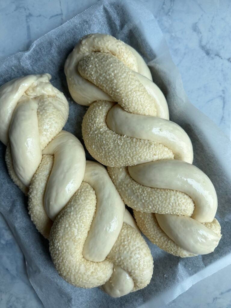 לאחר ההתפחה מחלקים את הבצק לפי הגודל הרצוי, קולעים חלות ומניחים אותן בתבנית עם נייר אפייה. מכסים להתפחה נוספת של 40-50 דקות.
