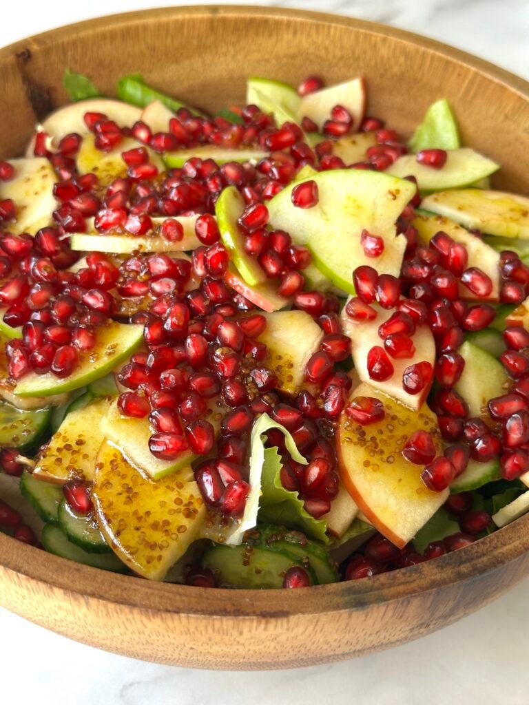 יש מנות חגיגיות שמספיק מבט אחד כדי להבין שהן הולכות לגנוב את ההצגה וזה בדיוק המקרה עם הסלט הזה. סלט רענן וצבעוני שמחבר בין מתיקות התפוחים, חמיצות עדינה של רימון ורוטב דבש–חרדל מושלם שמאזן הכל. זה מתכון פשוט וקל להכנה, שמכניס לשולחן ראש השנה טעמים קלילים ומרעננים לצד כל המנות המסורתיות. התוצאה היא סלט חגיגי שנראה נהדר על השולחן, טעים לכל ביס, וגורם לכל אחד לרצות לקחת עוד מנה. מתכון שיכול להפוך למנה קבועה אצלכם בכל חג ובמיוחד בראש השנה.