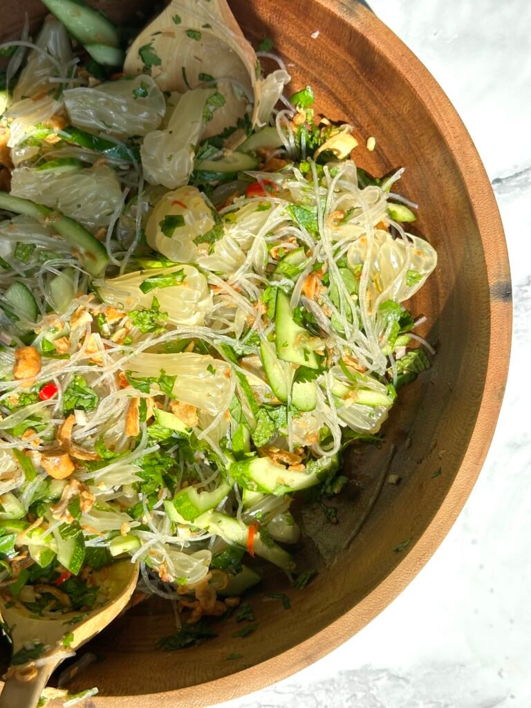 סלט פומלה תאילנדי רענן עם ירקות קראנצ’יים, אטריות שעועית, עשבי תיבול ורוטב חמצמץ-מתוק. מתכון בהשראת המטבח התאילנדי, בדיוק כמו שטעמתי כשגרתי 4 שנים בתאילנד – מנה קלילה, צבעונית ומיוחדת שתשדרג כל שולחן.